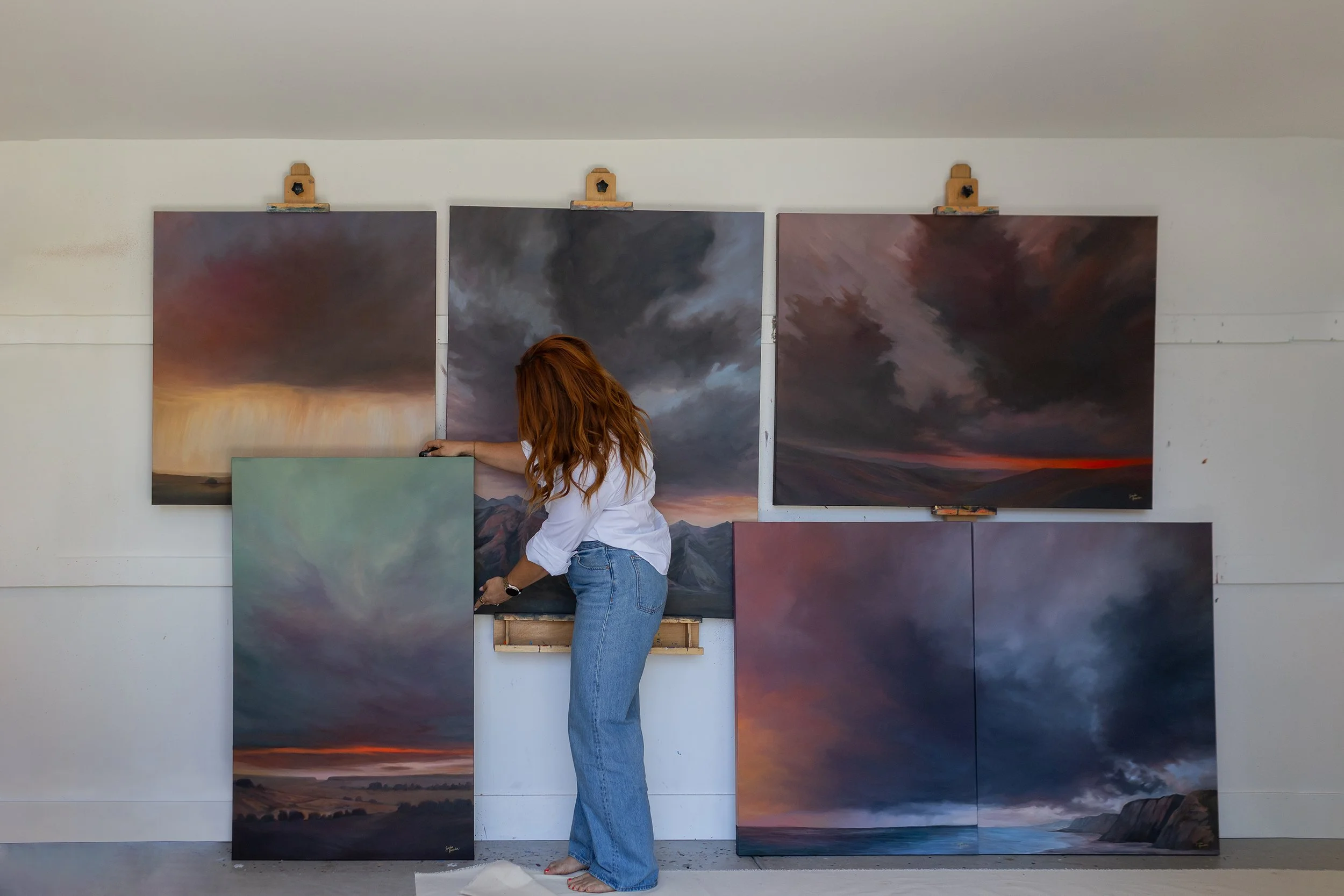 Breath Begins Again continues the quiet story that began in Held Between Breaths. These skies move from stillness into motion — golden light pressing through clouds, horizons opening, and air returning to the atmosphere. Each painting captures a moment when hope rises gently, like the first full breath after a long pause.